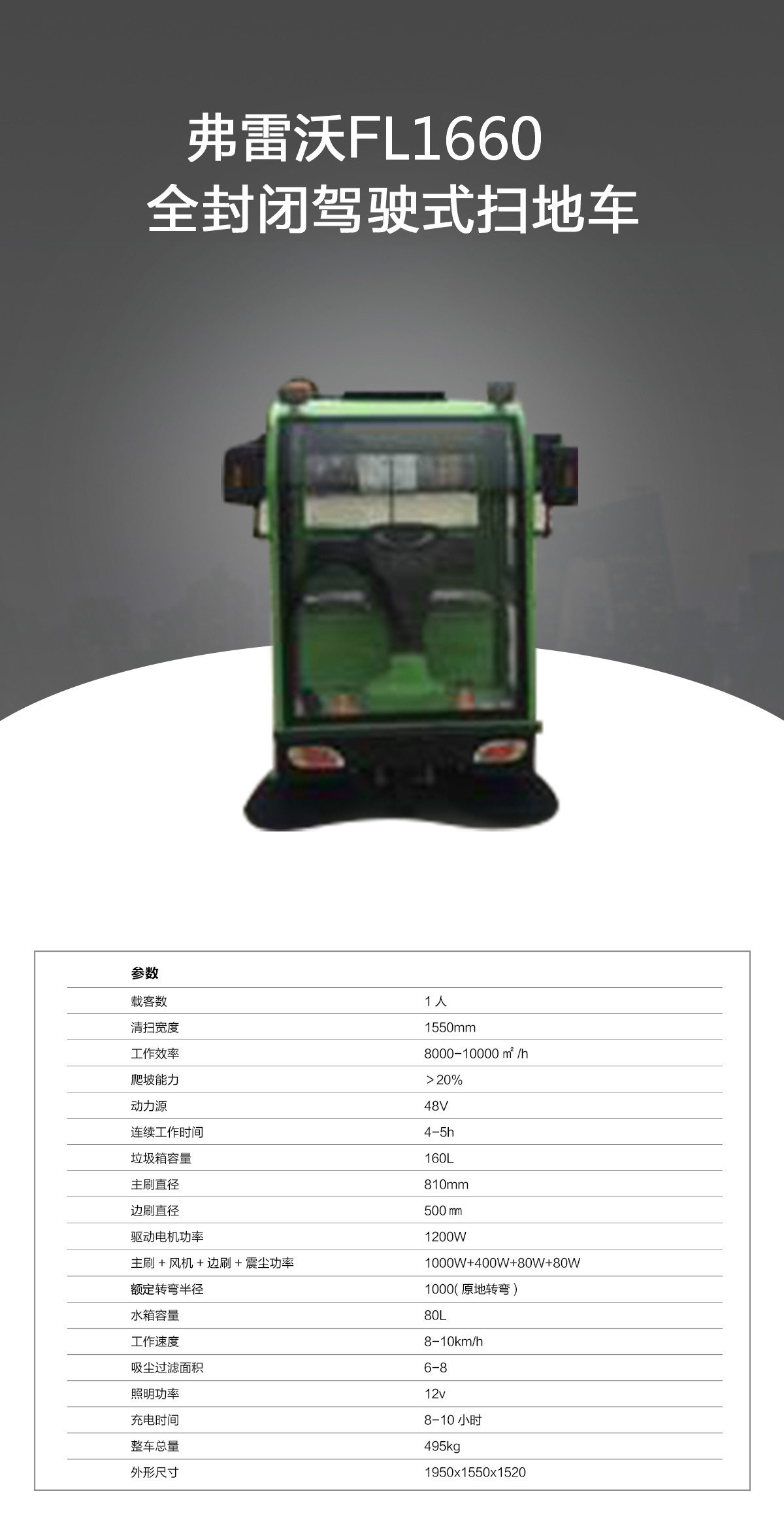 產(chǎn)品分類:駕駛式掃地機(jī)產(chǎn)品特點:1、全封閉駕駛式掃地機(jī)1660特有出口型免維護(hù)電瓶,區(qū)別于市面上其他電動掃地機(jī),其智能型充電機(jī)能有效延長電瓶使用壽命,可使連續(xù)工作時間更長。2、全封閉設(shè)計保護(hù)工作人員身心健康。3、底部主刷和兩側(cè)邊刷可自由調(diào)節(jié)高度使清掃效率更高,清掃寬度達(dá)到1550mm,完成1000㎡的地面清掃工作僅需6分鐘,比傳統(tǒng)人力清掃效率提高幾十倍,并且還能節(jié)省人力成本,省時省力、更省錢!4、控制面板友好,操作簡單、易懂,使用前工作人員無需特別培訓(xùn),“保潔大媽也能輕松操作完成清掃任務(wù)”。5、配備的優(yōu)良吸塵系統(tǒng)能夠有效抑制揚塵的產(chǎn)生,避免二次污染。適用環(huán)境:車站、機(jī)場、物業(yè)小區(qū)、倉庫、車間、園區(qū)、廣場、學(xué)校、醫(yī)院、商場、公園、市政單位、街道等公共場所地面。
