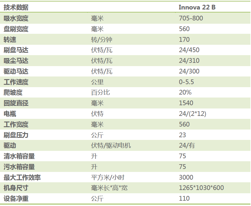 意大利COMAC駕駛式洗地機(jī)Innova22B產(chǎn)品特點(diǎn):1、配備高性能出口型免維護(hù)電瓶,使用壽命更久、動力更強(qiáng),可有效延長連續(xù)工作時間。2、節(jié)省清潔所用時間,完成1000㎡的地面清洗任務(wù)僅需20分鐘。3、清潔效率是傳統(tǒng)人力清洗的幾十倍,并且清潔效果更出色,噪音低,一臺洗地機(jī)能節(jié)省10幾名工人的開支,有效降低了清潔成本問題,管理維護(hù)成本極低,省力、更省錢!4、操作面板簡單、易懂,鑫金邦免費(fèi)提供上門培訓(xùn)服務(wù),“保潔大媽也能操作自如”。5、適用環(huán)境:小區(qū)物業(yè)、工廠車間、市政單位、商場、車站機(jī)場、廣場、公園、學(xué)校、醫(yī)院、倉庫、停車場等地。
