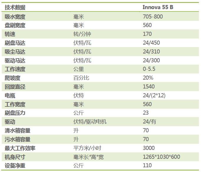 意大利COMAC高美(科邁克)駕駛式洗地機Innova55產(chǎn)品特點:1、配備高性能出口型免維護電瓶,使用壽命更久、動力更強,區(qū)別于市面上其他電動掃地機,可有效延長連續(xù)工作時間。2、有效縮短清潔所用時間,完成1000㎡的地面清洗任務(wù)僅需20分鐘。3、清洗效率是傳統(tǒng)人力清潔的幾十倍,并且清潔效果更出色,一臺洗地機能節(jié)省10幾名工人的開支,有效降低了清潔成本問題,省力、更省錢!4、操作面板簡單、易懂,鑫金邦提供免費上門培訓(xùn)服務(wù),“保潔大媽也能操作自如”。5、適用環(huán)境:小區(qū)物業(yè)、工廠車間、市政單位、商場、車站機場、廣場、公園、學(xué)校、醫(yī)院、倉庫、停車場等地。